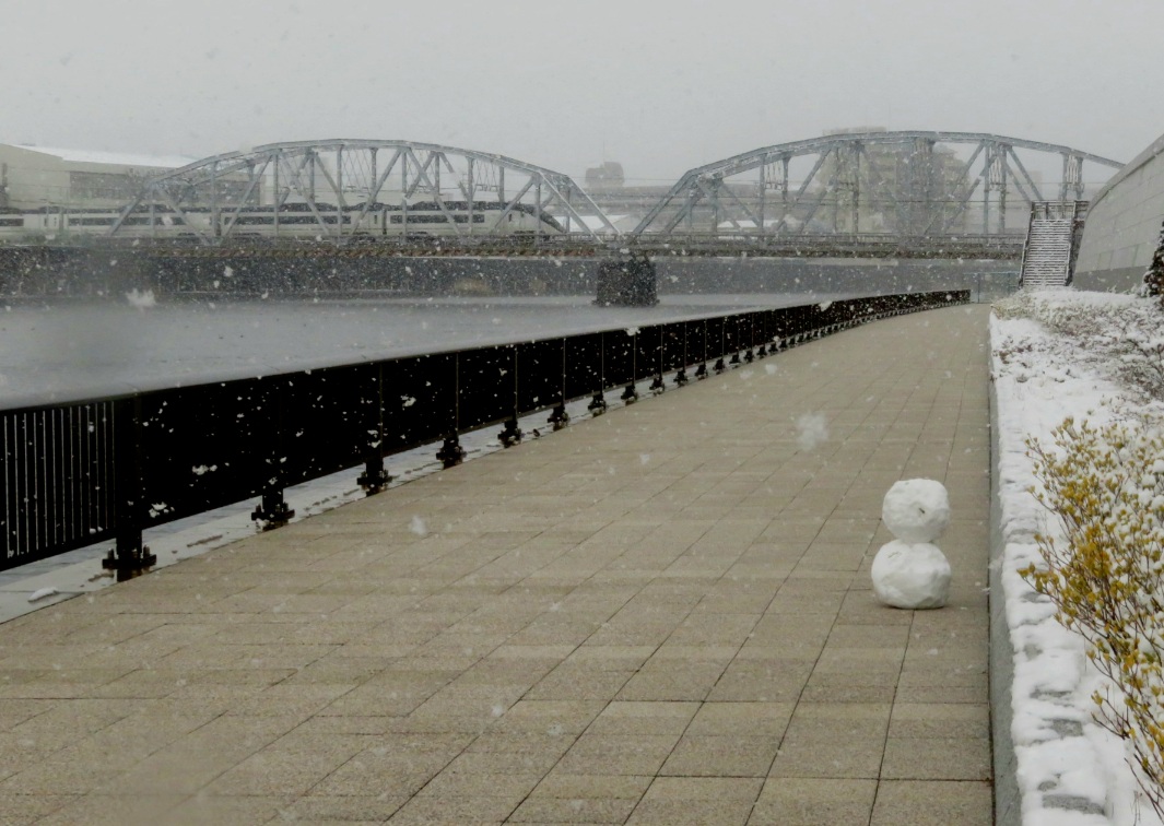 | 隅田川の土手では、子供達が楽しそうに土手滑り